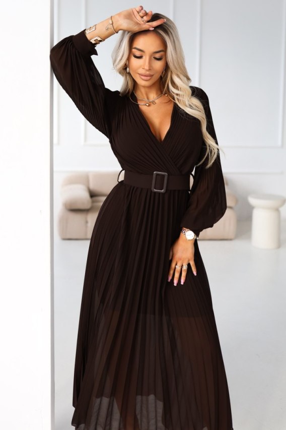 Czekoladowa plisowana sukienka maxi z kopertowym dekoltem, długim rękawem i paskiem podkreślającym talię - idealna na wesele, święta i eleganckie wyjścia. Numoco Basic.